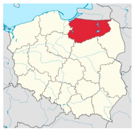 Warmia and Mazury province is located in the northeast part of Poland (Figure 2) [16]. This area is one of the most attractive tourist, sightseeing, and recreational regions in Poland. Its population is almost 1.5 million. The capital of the region is Olsztyn. The Warmia and Mazury province is the fourth largest voivodeship in Poland (area over 24,000 km2).