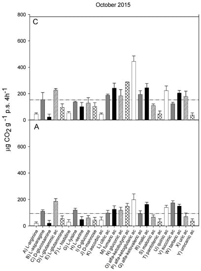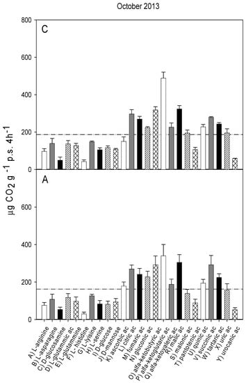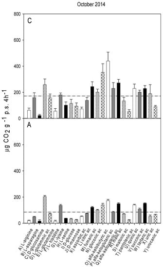 | C org (g kg−1 d.w.) | C | 43,9 ± 2.5 A, a | 54.7 ± 2.8 A, a | 49.2 ± 6.3 A, a | 47.8 ± 9.7 A, a | 53.7 ± 5.5 A, a |
