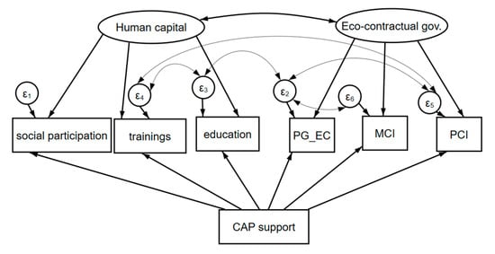 Structural equation model (SEM) for human capital and eco-contractual governance under Common Agricultural Policy (CAP) influence. Notes: For the description of variables, see Table 1; one side arrows indicate regression; two-side arrows indicate covariance. Eco-contractual gov. stands for eco-contractual governance, MCI—market contractual integration, PCI—policy contractual integration, PGEC—public goods-oriented eco-efficiency.