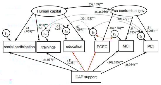 Standardized SEM estimations for human capital and eco-contractual governance under CAP influence. Notes: Standard errors in brackets; Red arrows indicate insignificant relations; *** p < 0.01, * p < 0.1; Eco-contractual gov.—eco-contractual governance; MCI—market contractual integration; PCI—policy contractual integration; PGEC—public goods-oriented eco-efficiency.