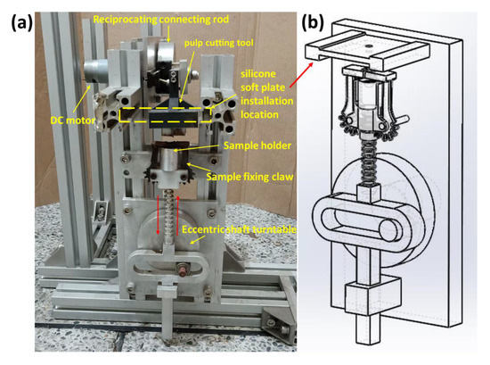 The semiautomatic dried longan pulp peeling and seed removing machine is based on aluminum extrusion. A stepping motor drives the eccentric shaft turntable in Figure 1a. The stepping motor’s control can accurately clamp the dried longan. When the eccentric shaft turntable motor rotates upward, the dried longan-fixing jaws will open. At this time, the dried longan is placed on the pedestal. The eccentric shaft turntable is turned downward, and the jaws will clamp the dried longan. After the dried longan is fixed, the DC motor starts to drive the cutting tool’s reciprocating link to cut the pulp. Because of the limited size of this machine, the longan pulp has been cut, and a silicone soft plate is installed along the aluminum extrusion groove, as shown in Figure 1a,b. To peel the pulp, the eccentric shaft turntable is turned up to the top, the dried longan in the holder is cut and squeezed with the silicone soft plate, and the longan seeds will pass through the hole. The longan pulp and seeds will then be separated; finally, the longan pulp remains under the silicone soft board, and its seeds will be placed on the top through the hole in the soft board, as shown in Figure 2.