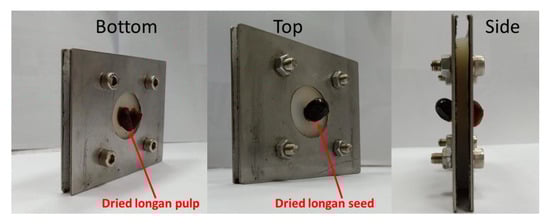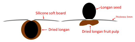 After squeezing the dried longan through the 6 mm hole of the silicone soft board, the pulp and seed are separated. The dried longan pulp will be below the plate while the seed will be above.