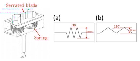 A schematic of a cutting tool for dried longan pulp. (a) A cutter with the blade width of 20 mm and 30° serrated bending angle. (b) A cutter with the blade width of 10 mm and 110° serrated bending angle.
