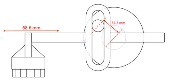 The pulp peeling and seed removing mechanisms are designed based on a wine opener’s linkage mechanism. The main structure fixes the aluminum extruder on the aluminum plate. When the stepping motor rotates, it will drive the eccentric shaft disk. The eccentric shaft turntable will drive the row of teeth on the lifting mechanism to synchronously drive the ratchet to open and close the clamping arm. The eccentricity of the shaft on the turntable is 34.3 mm, and the maximum displacement stroke is 68.6 mm. There is a material holder above the lifting rod and a ball socket in this holder in which to place the dried longan. The side of the lifting rod is equipped with a row of teeth to drive the clamping arm. This arm’s lower end has a semicircular ratchet for gear meshing transmission. The upper end of the clamping arm is equipped with clamping jaws to clamp and fix the dried longan. After the dried longan is clamped and fixed, a hole is cut in its pulp to remove its seed. Given that the dried longan’s average height is approximately 16.8 mm, the clamping height is set to 11.2 mm to stop the longan from turning during the opening process, as shown in Figure 5. Two-thirds of the dried longan’s average length must pass through the silicone soft board to achieve good peeling. Considering that the thickness of the silicone soft board is 5 mm, the mechanism’s stroke is at least 16.2 mm, and the total mechanical stroke of the peeling operation is at least 27.4 mm, as shown in Figure 5.