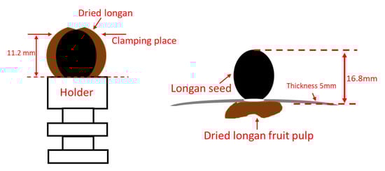 Mature longan can be conical, heart-shaped, spherical, or other shapes. Some varieties have a significantly longer appearance on one side. After the drying process, the fruit’s appearance will become wrinkled and rough. The dried longan’s shape will be irregular, such that its flesh will be close to the inner core and appear approximately spherical or oval. Commercially available dried longan was used as our experimental material in this study. All experimental samples were stored under refrigeration. Before use, they were placed at room temperature to regain moisture, before being heated to 60.0 °C in an oven to reduce the pulp’s viscosity. The dried longan was used to test the flesh peeling and seed removing machine developed in this study. The average diameter of longan samples (pulp containing seeds) was 17.20 mm and that of dried longan seeds was 14.95 mm.