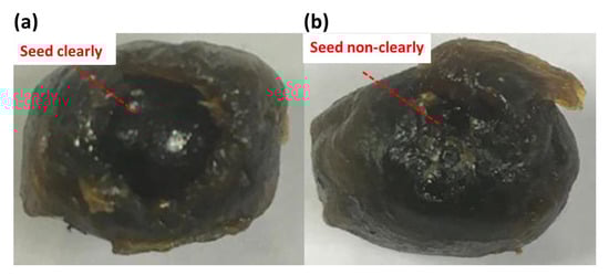 Based on our results, we recommend using a tool with a cutting surface width of 20 mm and a sawtooth bending angle of 30° to breach the pulp at a speed of 292.0 mm/s. After cutting, the dried longan should be squeezed with a silicone soft plate at a speed of 28 mm/s for seed removing. Another 100 dried longan samples were prepared for testing to verify the mechanical stability. The peeling success rate was found to be 86.0%, with a failure rate of 14%. Of the failures, three seeds had pulp remaining and 11 seeds failed to pass through the plate. After the dried longan pulp was cut, if the dried longan seeds were broken or unable to be seen clearly, as shown in Figure 7, then it was judged that the cut had failed. After cutting, the dried longan and silicone soft plate could not pass through the through hole in the silicone soft plate, with residual pulp on the seed surface and dried longan seed breaks judged as failed peel, as shown in Table 2. The speed parameters of the semiautomatic flesh peeling in Table 2 and the seed removal mechanism of the dried longan are provided as references for future research.