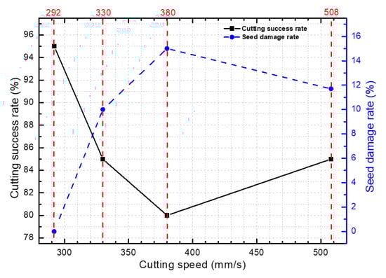 When the cutting speed is 292.0 mm/s, the average width of the breach is approximately 7.5 mm and the success rate is approximately 95.0% (57/60). The test sample has no broken seeds. When the cutting speed is 330.0 mm/s, the breach’s average width is approximately 7.3 mm, the success rate is approximately 85.0% (51/60), and the seed breaking rate is approximately 10.0% (6/60). When the cutting speed is 380.0 mm/s, the average width of the breach is approximately 7.5 mm, and the cutting success rate is approximately 80.0% (48/60), with a seed breakage rate of 15.0% (9/60). When the cutting speed is 508.0 mm/s, the average width of the breach is approximately 7.4 mm, the success rate is approximately 85.0% (51/60), and the seed breakage rate is approximately 11.7% (7/60). The test results suggest that reducing the cutting speed helps to increase the cutting success rate and reduce the seed breakage rate. A cutting speed of 292.0 mm/s yields the highest success rate without causing longan seed breakage.