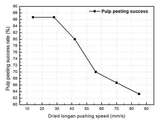 The lifting mechanism’s upward pushing speed is varied, and the relationship between this speed and the peeling success rate is analyzed. Tests are performed using 60 longans per group, and complete separation of the dried longan pulp and seed is defined as the successful peeling of the pulp. If the longan seeds have residual pulp, are broken due to pushing or cannot be separated from the pulp, the experiment is classified as a failure.