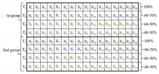 In an outdoor experiment, 128 potted plants of rice were grown under natural conditions at Zhejiang University (120°09′ E, 30°14′ N), Hangzhou City, Zhejiang Province, P.R. China. Frequently, a plastic cover was installed over the plants during precipitation to control the added water of plants, and obtain a heterogeneous water status of the tested leaves. To prepare experiment samples, the rice seeds (Xiushui 134) were submerged in the water for four days at a temperature of 28–30 °C, and the water was replaced twice a day. After germination, the 10 rice plants were sown into individual polyvinyl chloride (PVC) pots, which had dimensions of 140 × 95 × 125 mm. Each pot was filled with 300 g of black peat moss (HAWITA Gruppe GmbH, Vechta, Germany), and was irrigated to achieve saturation during the first growing month. The compound fertilizer treatment was applied, N–P2O5–K2O (15–15–15), with a rate of 100 kg ha−1 at 10-day intervals produced by Qingdao SONEF Chemical Company (Weifang, China). Potted rice plants were transplanted on 10 July 2018 and divided into two groups, each with 64 pots. It was harvested on 12 August and 30 August 2018 for the 1st and 2nd groups, respectively. Table 1 shows summary statistics of air temperature, relative humidity and vapor pressure deficit (VPD). The values of VPD were determined from the formula stated by []. In this experiment, there were two different growth stages of the rice plants: tillering and stem elongation. The water deficit was implemented within a time period of 27–34 days and 34–52 days of plant life for the 1st and 2nd groups, respectively. As displayed in Figure 1, an experiment was conducted with a completely randomized block design in a factorial experiment. The experimental design was divided into two groups, each comprising four irrigation treatments; fully-irrigated (T1: 100%), mild (T2: 80–70%), moderate (T3: 60–50%), and severe water stress (T4: 40–30% field capacity), respectively. The number of treatment replicates (R1, R2, …, etc.) was 16 samples. Generally, the gravimetric method was used to calculate the amount of water by weighing pots manually twice a day, followed by replacing the water transpiration to keep the respective moisture stress conditions. Gross water applied volumes were estimated for each group, 1st group values were 70.96, 66.64, 63.04, and 59.44 L (liter) for well-controlled, mild, moderate, and severe stress conditions, respectively. In addition, their corresponding values at the 2nd group were 96.56, 90.16, 85.36, and 78.96 L, respectively.
