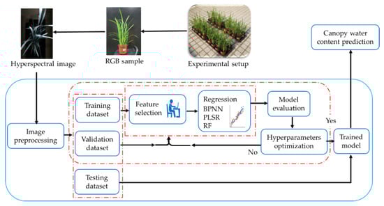 Another factor that highly influences the efficiency of water content prediction is the model selection and hyperparameter optimization. In this paper, we focus on innovative algorithms for retrieving canopy water content from hyperspectral data, in particular PLSR, BPNN, and RF. The PLSR has been successfully used with spectral data to forecast relative water content [], estimate leaf nitrogen content [], and obtain leaf fuel moisture content []. Neural networks have also been evaluated to develop water content prediction models. The BPNN was used to forecast leaf water content and reported a satisfactory coefficient of determination as 0.86 with a low RMSE (1.3%) []. The RF is robust against the over-fitting and has been used effectively in regression problems even with dozens of samples [,]. The main advantages of the RF algorithm are that it is not restricted to variable distribution, nor susceptible to outliers and noises, and is a high-dimensional data-sensitive method []. This model has been widely used in generating a regression model and obtaining good prediction results []. Additionally, the performance of any machine learning (ML) model is profoundly affected by hyperparameter selection, which has several benefits; it can increase the performance of ML algorithms [] and improve the reproducibility and fairness of scientific studies []. Moreover, it could perform a major role in improving the prediction model because of the direct control of the behaviors of training algorithms [].