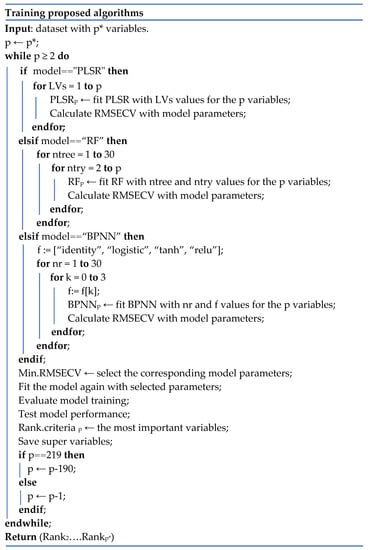 One of the purposes in this research was to compare different features with regression models. The three types of the dataset (samples × features) for analysis were (89 × 12), (89 × 219), and (89 × 6). These data were employed for training three regression models; PLSR, RF, and BPNN. We optimized the models by selecting the best hyperparameters. The parameters were an optimal number of latent variables (LVs) with PLSR, the number of trees (ntree) and features (ntry) at every tree node for training RF model, number of neurons in the hidden layer (nr), and activation function (f) in the BPNN model. The main steps for training the models, and estimating the right parameters and features are described in Figure 3. This figure illustrates the pseudo-code for each model in order to achieve a combination of optimal features of at least 2 variables. The number of features in each loop was at spectral bands; 256, 29, 28, …, 2, vegetation indices; 12, 11, 10, …, 2, and PCA bands; 6, 5, 4, …, 2. During looping, the most important features were picked up and the rest were excluded. Then, it was easy to compare all outputs to determine the best features set that could improve the prediction of water content in rice.
