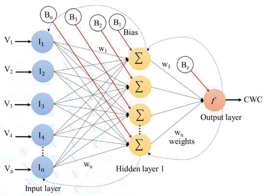 This network uses the Multi-Layer Perceptrons (MLPs) as a supervised learning algorithm that includes a flexible function to train a specific data set []. MLPs is one of the neural network models, has the same architecture of back-propagation for supervised training. Back-propagation is typically used for training of feed forward. The neural net is structured from three types of layers: (1) the input layer is primary data for the neural network; (2) the hidden layer is an intermediate layer between independent inputs layer and dependent output layer, and (3) the output layer produces the results of the specified inputs. Figure 4 displays the architecture of the neural artificial network is a class of machine learning algorithms that uses multiple layers to gradually extract high-level features from the raw input. Five circles as input layers are noted as vector I. The network contains one hidden layer, the number of nodes determined according to regression accuracy. Four circles with one hidden layer represent the “activation” nodes and are usually noted as weight (W). The final circle refers to the output layer that shows the predicted value of canopy water content. The bias neuron (B) is a special neuron added to each layer in the neural network, which is usually taken to be 1 []. The artificial neural network models are generalized mathematical models that use a series of neurons or nodes interlinked by weighted connections to simulate human cognition as it applies to pattern identification and prediction [,].