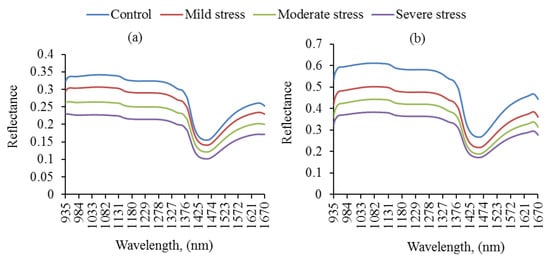The average reflectance spectra under different water stress conditions during two growth stages of rice plants are explained as shown in Figure 5. The values of mean soil water content in the 1st stage (tillering) were 88, 78, 66, and 49% for well-controlled, mild, moderate, and severe stress conditions, respectively. Moreover, their corresponding values in the 2nd stage (stem elongation) were 85, 72, 60, and 40%, respectively. At the band of 1450 nm, the figure shows that the height of the valley decreases as water content decreases where there is strong water absorption. A greater increase in canopy reflectance was observed in the NIR region for the control treatment and low reflectances for soil moisture stress treatments. Besides, the rice water content in the 2nd stage is greater than the 1st stage, and the spectrum at the 2nd stage was showing a higher reflection trend. These results are in agreement with Carter [,] who explained that the absorption by pigments and water in the range of near-infrared (NIR; 700–1300 nm) is relatively low, thus, the reflectance is relatively high. In addition to [], higher absorption of infrared radiation resulted in leaf heating and transpiration. Hence, the lower reflectance in the NIR region further confirmed the soil moisture stress-induced reduction in transpiration and stomatal conductance in the rice canopy at its vegetative stage. The pattern of the reflectance curves is close to that for other green plant leaves such as maize [].