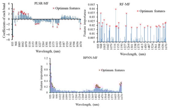In other feature selection techniques, the model-based features (MF) selection method chooses a subset of features that have good discriminative ability and predictive information []. The MF can improve model performance by getting rid of redundant features and prevents the model from over-fitting and has the added advantage of keeping the original feature representation, thus, offering better interpretability []. Feature selection algorithms have become an apparent need for prediction and modeling []. Many studies have explored the possibility of using different algorithms to reduce data dimensions. As to partial least square regression (PLSR), the weighted regression coefficient of each variable in the partial least squares (PLS) model indicates the significance of the wavelength in the model []. At random forest (RF), all variables are ranked according to their importance []. A back-propagation neural network (BPNN), Glorfeld [] concluded an index that can be used for selecting the most important variables. The principal component analysis (PCA) is a suitable implement for decreasing the correlation among high-dimensional data and selecting the most relevant features in the original variables []. The importance of hyperspectral bands is established based on high factor loadings (eigenvectors) associated with these wavebands on the principal component axes of PCA [].