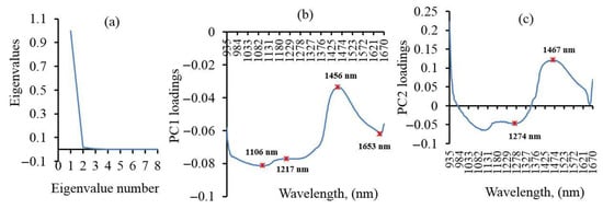 (a) The proportion of variance of reflectance data described by the two eigenvectors with the largest eigenvalues, and wavelengths selection from loadings of the first two principal components: (b) PC1-loadings, and (c) PC2-loadings.