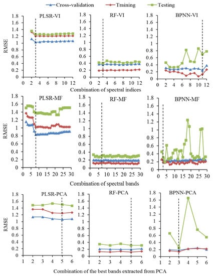 There are three types of features for predicting the water content in rice: (1) the best bands selected from PCA; (2) picking the optimum bands after training variables, that is model-based features (MF), and (3) vegetation indices (VI). These features were trained with different models (PLSR, RF, and BPNN) and the less important features were excluded. Al Iqbal [] explained that some features are less important, however, some are very significant. The superlative model and the ideal combination of features were chosen when a minimum RMSECV value was reached.