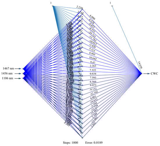 The neural network design after gathering senior features is presented in Figure 10. This figure showed the best structure of the trained neural network with the variants chosen. Neural network conveys basic information such as the trained synaptic weights, a number of hidden neuron layers, steps for converging, and the overall errors. Network topology is constructed with a specific combination of input variables with a number of hidden neuron layers. For example, an eminent model of BPNN-PCA-MF contains an input layer of 3 bands (1467, 1456, and 1106 nm) and a single hidden layer with 28 neurons as shown in Figure 10. The presented planning depicts the neural network with prominent bands; the training process needed 1000 steps to achieve less error function. The process has an overall error of about 0.0189. Furthermore, before nominating the most influential bands, the training process at 6 PCA bands needed 1000 steps with the process having an overall error of about 0.0251.