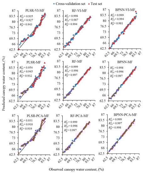 From the findings, the best feature selection method for estimating the canopy water content in rice was PCA combined with MF (PCA-MF). This was the premium integration to filter out the super variables. Moreover, the MF approach was combined with VI (VI-MF) to improve model performance. There are nine approaches as a new prediction methodology, including the integration of PCA-MF, VI-MF, and MF with three models: PLSR, RF, and BPNN. The regression models were trained with the uppermost features (independent variables) for predicting the CWC (dependent variable). The projected CWC values were then compared to the reserved values that were not implemented for machine learning. Figure 11 illustrates the scatter plots of the observed and predicted CWC in rice through integrating the proposed feature selection methods and the different models. This study evaluated multivariate methods and compared the results clearly, so the use of multivariate methods greatly enhances predictability. As well, independent validation can be considered the most robust method for assessing the accuracy of a regression model, because validation data are not involved in the process of model development. The BPNN-PCA-MF-3 was the first best predictive model as evidenced by the performance and showed a stronger relationship between the reflectance spectra and CWC. The predictability of this model was developed by PCA that can select optimum wavebands and eliminate data redundancy and outliers [], then select the most critical bands on the basis of the MF. The values of R2 at BPNN-PCA-MF-3 were 0.997 and 0.998 for cross-validation and test set, respectively. This model can reduce the regression error to a minimum (RMSE = 0.183 in cross-validation) for predicting the water status. The three bands involved in this model are of great importance in predicting water content. The RF-MF-7 model was the second-ranked according to performance. The RMSE value in cross-validation was 0.189. Its outputs with R2 were 0.996 and 0.997 for cross-validation and test set, respectively. The third most reliable model was RF-PCA-MF-5 with an RMSE of 0.197 in cross-validation. The R2 was 0.996 and 0.997 for cross-validation and test set, respectively. The results explained that the performance of PLSR with VI-MF, MF, and PCA-MF was a less predictive model (R2 = 0.943, 0.932, and 0.919 in prediction, respectively) compared to others to monitor the water condition in rice. This is agreed with Krishna et al. [] who described that each coefficient in the PLSR model has an associated RMSE, making it more prone to deviation. As a result, the combined model of PLSR with different feature selection approaches was less-performing for predicting CWC.