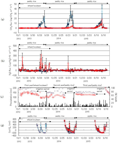 - Hasukawa, H.; Inoda, Y.; Toritsuka, S.; Sudo, S.; Oura, N.; Sano, T. Effects of mitigation strategies on greenhouse gas emissions from a paddy field on gray lowland soil under a paddy-upland rotation system with four-crops over three-years. Jpn. J. Soil Sci. Plant Nutr. 2019, 90, 1–12, (In Japanese with English summary). [Google Scholar]
