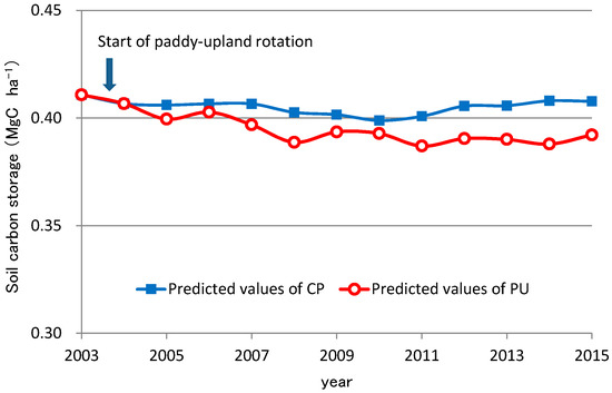 The predicted value of soil carbon storage in the CP field since the start of PU rotation was almost constant, i.e., 0.411 Mg C ha−1 in 2003 and 0.408 Mg C ha−1 in 2015, whereas, in the PU field, it showed a decreasing trend, i.e., 0.411 Mg C ha−1 in 2003 and 0.392 Mg C ha−1 in 2015 (Figure 2). The average changes in the amount of soil carbon per rotation were −0.03 Mg C ha−1 years−1 in the CP field, and −0.15 Mg C ha−1 years−1 in the PU field. Accordingly, the slight decreases in the amount of soil carbon in the CP and PU fields corresponded to increases in CO2eq emissions of 0.09 and 0.57 Mg CO2 ha−1 year−1, respectively.