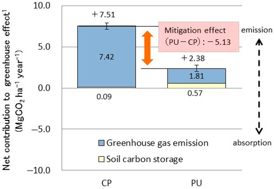 If the value was positive, it suggested a net emission, and if the value was negative, it suggested a net absorption. The mitigation effect was evaluated by subtracting the CP value from the PU value.