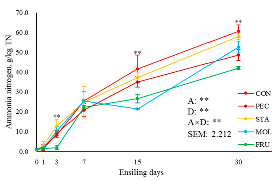 Effect of additives on the ammonia nitrogen (AN) content during ensiling of alfalfa. TN, total nitrogen; CON, control; PEC, pectin; STA, starch; MOL, molasses; FRU, fructose. A denotes significance of additives; D, denotes significance of ensiling days; A × D denotes the interactive effect between additives and ensiling days. SEM, standard error of means. The asterisks (** p ≤ 0.01) indicate the significance of additives and ensiling days and their interaction effects, and the difference at the specified ensiling day.