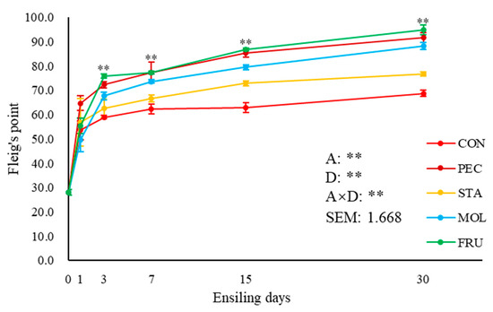 In addition, additives, ensiling days and their interaction exerted significant effects on the Fleig’s point of alfalfa silage (Figure 3). Additives exhibited significant effects at 3, 7, 15, and 30 d after ensiling (Table 1, p ≤ 0.01). The PEC and FRU treatments of alfalfa silage significantly increased Fleig’s point compared with other treatments. CON exhibited lower Fleig’s point than the other treatments throughout the ensiling period.