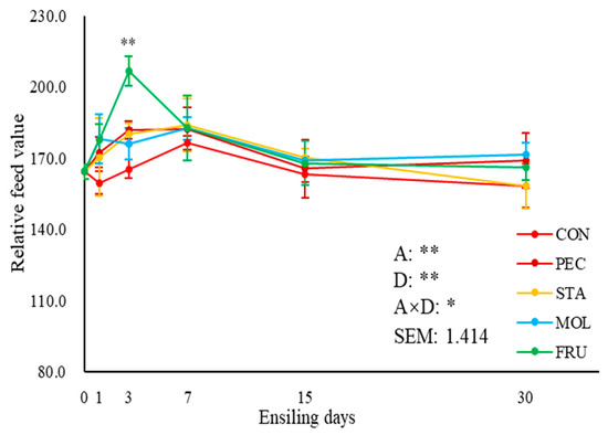 Effect of additives on the relative feed value (RFV) during ensiling of alfalfa. CON, control; PEC, pectin; STA, starch; MOL, molasses; FRU, fructose. A denotes significance of additives; D, denotes significance of ensiling days; A × D denotes the interactive effect between additives and ensiling days. SEM, standard error of means. The asterisks (* p ≤ 0.05; ** p ≤ 0.01) indicate the significance of additives and ensiling days and their interaction effects, and the difference at the specified ensiling day.