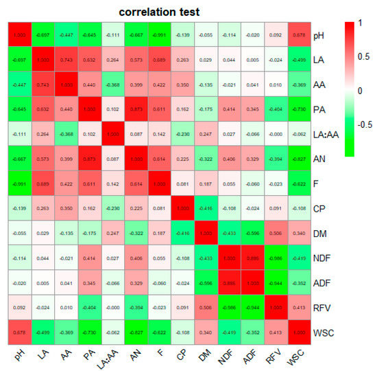 Pearson correlation between the fermentation and chemical indexes of alfalfa silages throughout the ensiling period. LA, lactic acid; AA, acetic acid; PA, propionic acid; LA:AA, lactic acid: acetic acid ratio; AN, ammonia nitrogen; F, Fleig’s point; CP, crude protein; DM, dry matter; NDF, neutral detergent fiber; ADF, acid detergent fiber; RFV, relative feed value; WSC, water-soluble carbohydrates. The number in each square represents the correlation extent; the color represents significant correlation (p < 0.05), the deeper the color of the square is, the more significant the correlation. The red color means a positive correlation, and the green color means a negative correlation.