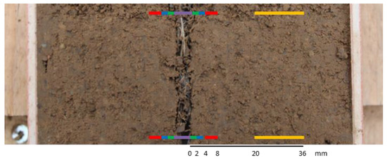 Sampling of the biopore lumen (purple), biopore sheath (green, blue, red) and bulk soil (yellow). Lateral distances in [mm] from the pore wall surface.