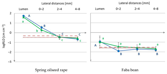 Log10-transformed RLD [cm cm−3] of spring oilseed rape and faba bean in different biopore types (worm type = blue; root type = green). Mean and SE of lateral distances. Means not sharing a common letter indicate significant differences between lateral distances (Tukey-HSD, α = 0.05); Uppercase letters show differences for worm type and lowercase letters for root type. Red lines show the mean of the bulk soil sample for the root (