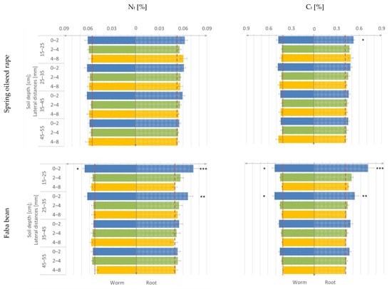 Lateral variation of Nt- and Ct-Content from biopore wall to bulk soil (red line) in worm and root biopores of spring oilseed rape and faba bean. Mean and SE of lateral distances at each depth intervals. Data of worm type at the left side and of root type at the right side of the graph. Means with an asterisk are significant higher than the bulk soil as the control (Dunnett-test, α = 0.05; p * < 0.05, ** < 0.01, *** < 0.001); Layers of the biopore sheath in blue = 0–2 mm, green = 2–4 mm and yellow = 4–8 mm.
