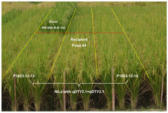 Dwivedi, P.; Ramawat, N.; Dhawan, G.; Gopala Krishnan, S.; Vinod, K.K.; Singh, M.P.; Nagarajan, M.; Bhowmick, P.K.; Mandal, N.P.; Perraju, P.; et al. Drought Tolerant near Isogenic Lines (NILs) of Pusa 44 Developed through Marker Assisted Introgression of qDTY2.1 and qDTY3.1 Enhances Yield under Reproductive Stage Drought Stress. Agriculture 2021, 11, 64. https://doi.org/10.3390/agriculture11010064