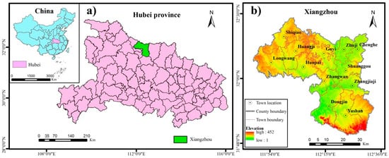 Study area: (a) location in Hubei Province, China; (b) digital elevation map (DEM) of Xiangzhou.