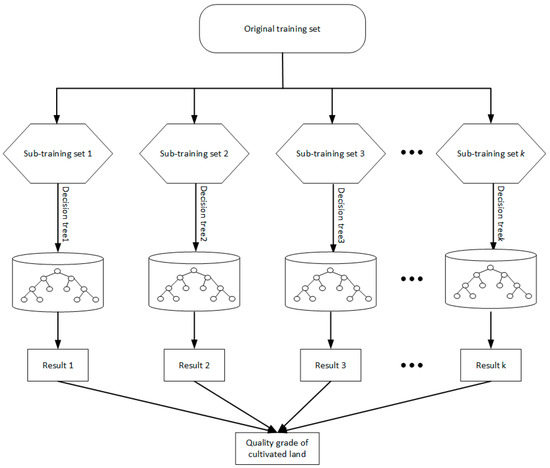 The key to constructing an RF model for farmland quality assessment is to analyze the correspondence rules between assessment indicators and quality grades of farmland, which is achieved through decision trees [35]. A binary decision tree consists of a root node, a child node, and a leaf node. The root node represents the observation value of indicators. The path from the root node to the leaf node corresponds to the assessment rule. The leaf node corresponds to the assessment results. The fundamentals of RF model construction for farmland quality assessment are shown in Figure 4. First, different sets of training samples are randomly selected using bootstrap to be input into each decision tree to form different classifiers. The attribute value of each indicator that has a nonlinear relationship with the assessment object is decomposed into leaves with a linear relationship using the random split node technique. Then, the weight of each indicator is calculated through the analysis of the leaf node structure. The set of relationships between the indicator and the weight according to the linear rules corresponding to the decision tree is formed, and the RF model is outputted. The average of the sum of the index values at each leaf node multiplied by their weights is the final assessment result. The RF model is constructed as follows.
