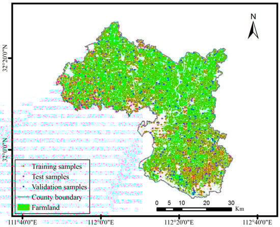 Based on Table 1 and the results of the national farmland quality grades, the original sample set was generated from randomly selected farmland patches of different quality grades in Xiangzhou, and adjusted according to the spatial location of the samples to achieve uniform distribution, with a total of 1590 samples selected. Then, 70% of the data was randomly selected as a training sample (1110), 20% as a test sample (320), and 10% as a validation sample (160), as shown in Figure 5. First, 1590 training sets equal to the number of samples were chosen randomly with playback from the training sample. Second, the indicator attribute values were sampled and learned multiple times until the average error rate was stabilized using R to access the random forest library. Then, based on the mapping of quality index to attribute values for each indicator, a decision tree was constructed to output the rules for predicting the quality index of farmland. The above steps were repeated to construct different decision trees for training the RF model for farmland quality assessment, which were applied to the assessment of Xiangzhou in 2018. The results showed that the coefficient of determination (R2) for the training sample was in the range of 0.7727–0.9483 (Table 4) and was significant at the 5% level, with high prediction accuracy.