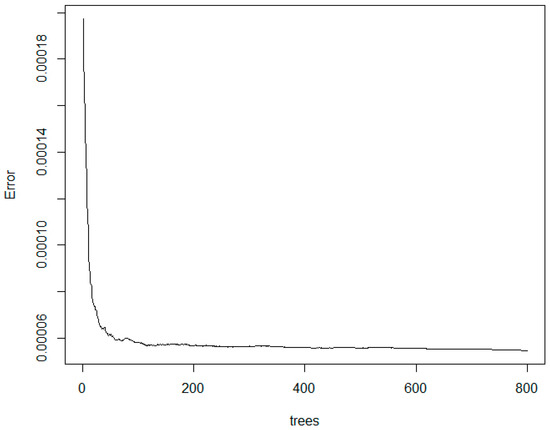 The random forest package in R was used to apply out-of-bag (OOB) data for unbiased estimation of the accuracy of the RF model in this study. After debugging and parameter sensitivity analysis, the OOB error tended to stabilize when the number of decision trees was greater than 200 (Figure 6). The overall error of the model and the coefficient of determination (R2) were compared by adjusting the number of assessment indicators (Table 4) to determine the optimal segmentation node (n). The error was minimized and R2 was maximized when the number of node segments (n) was 7.