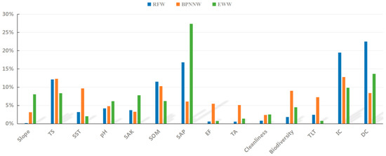 The RF weight (RFW) for each assessment indicator was calculated based on the reduction in the Gini index produced by RF during the training process. The drainage capacity, irrigation capacity, soil available phosphorus, topographic site, and soil organic matter were identified as the five most important indicators affecting farmland quality in RFW, with a total weight of 82.41% (Figure 7). Slope, traffic accessibility, and ease of farming were the three indicators that had the least impact on farmland quality, with a weight of only 1.35%. Meanwhile, the weight of each indicator in BPNN (BPNNW) and EW (EWW) were calculated. The BPNNW identification was more balanced, with drainage capacity and irrigation capacity being more important, and slope and cleanliness the least important indicators. EWW identified soil available phosphorus as the most important indicator, and ease of farming as the least important. Thus, the difference between RFW and BPNNW was small in terms of indicator weight values, while the difference between EWW and BPNNW was significant. Adequate drainage and irrigation capacity are important for farmland productivity, soil available phosphorus and soil organic matter reflect the fertility of farmland, and topography is an important factor limiting farmland productivity in hilly areas. Therefore, they all have an important impact on farmland quality. Regularity among slope, traffic accessibility, ease of farming, and the remaining indicators is not sufficiently evident. Thus, they were identified by RF as the least-important impact factors.