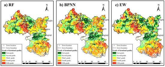 Spatial distribution of farmland quality grades: (a) Random forest (RF)—based, (b) Backpropagation neural network (BPNN)—based, and (c) Entropy weight (EW)—based.