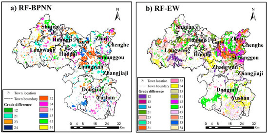 Overall, as far as the average farmland quality index for Xiangzhou was concerned, RF > BPNN > EW, with values of 0.8275, 0.8271, and 0.7532, respectively. Thus, the farmland quality in Xiangzhou was higher. For the average farmland quality index of each town, the assessment results of RF and BPNN were relatively similar, but there were also significant relative differences in terms of local regions. As can be seen in Table 5, the percentage of area of each measured farmland quality grade based on RF was closer to that of BPNN, but differed significantly from that of EW; the most significant difference was for first grade, which was 8.88% for RF and 16.68% for EW. In Figure 8a, it can be seen that first-grade farmland based on RF was mainly distributed in Zhangwan, Guyi, and Longwang, while that based on EW was mainly distributed in Shuanggou, Chenghe, Guyi, Longwang, and Shiqiao (Figure 8c). Shuanggou and Chenghe are industrial towns in Xiangzhou with high urbanization and high intensity of farmland use, and existing studies have shown that the heavy-metal element content of farmland soil around the towns is high overall, so it is unreasonable for the farmland to be identified as first-grade land [44,55]. The topography of Shiqiao is high and the soil water and fertilizer retention ability is poor, so theoretically, the quality grade of farmland should be lower, which is consistent with the existing research results [56]. RF identified Shuanggou as having high-grade farmland quality (Figure 8a), while BPNN identified it as low grade (Figure 8b). Shuanggou has a flat terrain, fertile soil, numerous rivers, abundant water sources, and relatively complete irrigation and drainage facilities, and its natural geographical conditions are advantageous for the development of arable agriculture. Therefore, this town should, theoretically, be an area of high-quality farmland. This analysis is also empirically supported by numerous studies [57]. The results of the EW assessment differed greatly from the other two methods. Areas with higher quality farmland were mainly distributed in Zhangwan, Shuanggou, Chenghe, and Prison Farm, while areas with lower-quality farmland were mainly distributed in Huopai, Yushan, and Huanglong (Figure 8c).