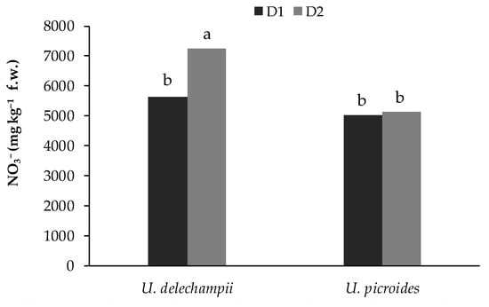 Cultivated at density D2, U. delechampii had a nitrate content of about 7200 mg kg−1 f.w., which is 38% higher than in plants of the same species grown at density D1 and in plants of U. picroides (Figure 3).