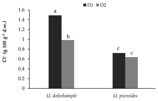 Chloride content in U. delechampii and U. picroides grown at two plant densities: 824 plants m−2 (D1) and 412 plants m−2 (D2). The same letters indicate mean values not significantly different (p = 0.05).
