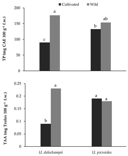 Total phenols (TP) and total antioxidant activity (TAA) of smooth golden fleece (U. delechampii) and prickly golden fleece (U. picroides) grown in a floating system (cultivated) and gathered in grasslands (wild). TP and TAA were considered significantly different at p ≤ 0.05 and p ≤ 0.01, respectively. The same letters indicate mean values not significantly different (p = 0.05). CAE = caffeic acid equivalent. Trolox = 6-hydroxy-2,5,7,8-tetramethylchromane-2-carboxylic acid.