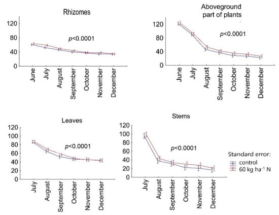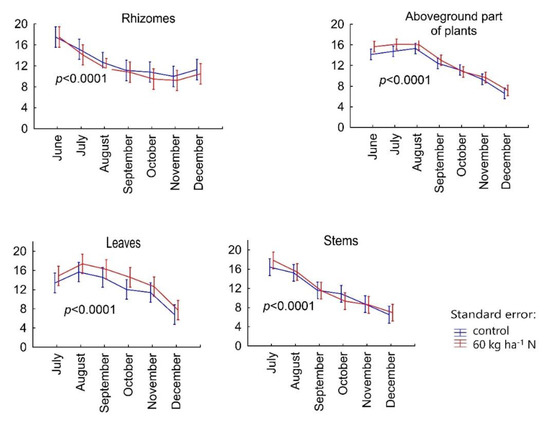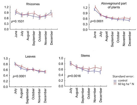 The effect of nitrogen fertilisation on ash content in the rhizomes (p = 0.0035), stems (p = 0.0002) and aboveground part of Miscanthus × giganteus (p < 0.001) except for the leaves was found. Even though rhizomes are not involved in the combustion process, knowledge of the ash content of rhizomes allowed the ash content to significantly increase from 2014 to 2016 in rhizomes (p = 0.0156), whereas the highest content was found in the leaves (p = 0.0312) in 2015 (the lowest annual sum of precipitation—392 mm). The highest content of ash was observed in the aboveground part of plants in the first year (p = 0.0047). The highest content of this component was found in leaves, which is particularly beneficial as the stem has the greatest share in the process of biomass combustion (Table 1). The highest content of crude ash was found at the beginning of the vegetation period, and as the plants developed (and also as a result of the ageing processes), its content decreased. The decrease in ash content in stems was greater than in leaves at the beginning of the vegetation period (Figure 2). The figures show the significance values of differences (p-values) of ash content in subsequent months of observation for control and dose 60 (Figure 2).