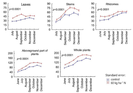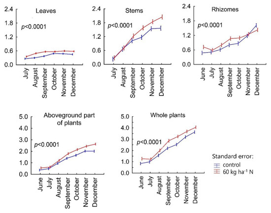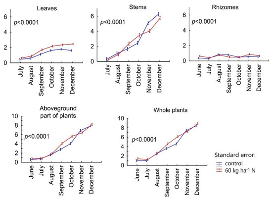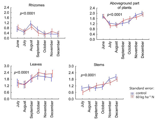 Rhizomes accumulated potassium until the end of vegetation (increasing trend). Without nitrogen fertilization in the aboveground part of plants, the peak potassium uptake was observed in November, whereas the highest accumulation was seen earlier on the plots with nitrogen fertilization (Figure 5). The figures show the significance values of differences (p-values) of potassium uptake in subsequent months of observation for control and dose 60 (Figure 5).