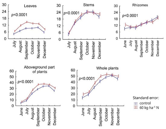Nutrient remobilisation seems to be a good strategy for perennial rhizomatous grasses [37,38] and represents an environmentally friendly strategy to reduce fertiliser applications [36]. When calculating the nutrient balance and fertiliser recommendations, the remobilisation of nutrients within the plant must be taken into account [25]. September and March are irrelevant for nutrient remobilisation [28]. The increase in nutrient content found in rhizomes in autumn and winter may be caused by remobilisation from the aboveground parts to the underground part [25]. In our research, generally, nutrient concentrations were highest at the beginning of the growing period and decreased clearly during the growing season. There were no significant differences caused by N fertilisation (except for potassium in leaves and sulphur in stems). The large loss of K from shoots between September and harvest can be attributed to leaching from the senescent plant material as K is not organically metabolised [39]. Some leaves fell after the end of the growing period, contributing to improved properties of soil by increasing the contents of elements and organic matter, thereby leading simultaneously to a decrease in ash uptake by plants [24]. The mineral concentration of aerial biomass is at its highest during spring and early summer and then declines, probably as a result of remobilization [24]. These results are also confirmed by own research in the aboveground parts of plants. It is documented that mineral concentration in the aboveground biomass of Miscanthus × giganteus decreases gradually from autumn to winter [24,28]. Our results highlight a decline in the concentration of crude ash and macronutrients in aboveground parts of plants from spring to autumn.
