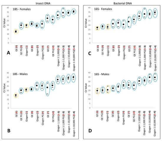 DNA extraction methods compared with cycle threshold (Ct) values for A. solanicola 18S (“Insect DNA”; extracted from females, (A), and males, (B)) and Candidatus Liberibacter 16S (“Bacterial DNA”; extracted from psyllid females, (C), and males, (D)). Numbers in brackets refer to the DNA extraction method numbers used in the text, while the standard kit used is indicated (Quick extract (QE)/Qiagen), with the addition of propylene glycol (PG) incubations overnight for some methods. Orange ovals indicate destructive DNA extraction methods, while blue ovals indicate non-destructive DNA extractions. Black dots are averages of five individuals, with maximum (+) and minimum (-) values reported.