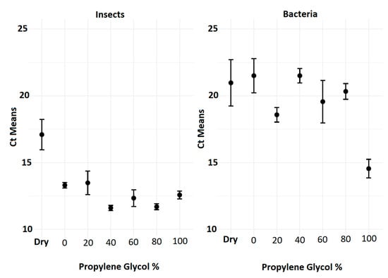 Plots showing the mean (dots) and standard deviation (bars) of the Cts obtained performing qPCR for A. solanicola (“insects”, left) and Ca. Liberibacter (“bacteria”, right) on the control vials at different PG solutions, frozen on day 0 of the experiment. Lower Ct indicates better preservation.