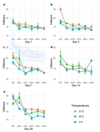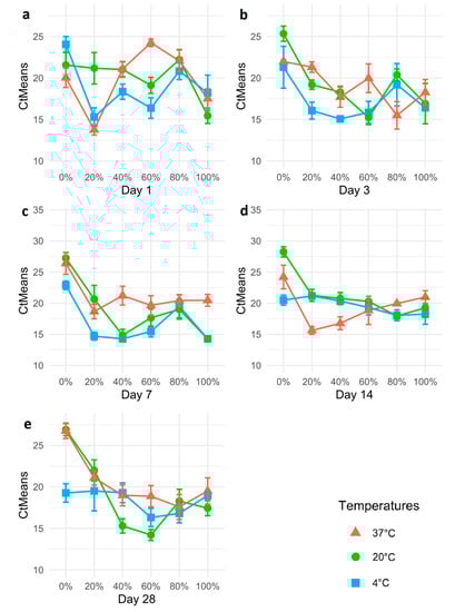 On day 1, CLbr was detected in all psyllid treatments, with Cts ranging between 13 and 28 and a mean of 19 with a standard deviation of 3.622. When analysed by PG% (with all the temperature results pooled), 20% and 100% PG show earliest amplification and 0% and 80% PG amplifying at later cycles (Figure 4). On day 3, CLbr detection across all psyllid treatments ranged between 12 and 27 Ct with a mean of 18.5 and a standard deviation of 3.7. When analysed by PG% (with all the temperature results pooled) 40 and 60% PG show earliest amplification and 0% PG amplifying later. On day 3, a trend starts to form for data by temperature, with 4 °C showing a lower average Ct for each target compared to 20 and 37 °C (Figure 4b). On day 7, CLbr detection across all psyllid treatments was between 13 and 31 Ct with a mean of 19 Ct and a standard deviation of 4. A temperature trend is more pronounced with an overall average of 16.8 Ct for 4 °C treatments, 18.9 Ct for 20 °C treatments and 21.1 Ct for 37 °C, which is approximately a 10-fold decrease in CLbr between 37 and 20 °C and over a 15-fold reduction between 37 and 4 °C (Figure 4). On day 14, CLbr detection across all psyllid treatments was between 13 and 30 Ct with a mean of 20 Ct and a standard deviation of 3.4. The samples incubated at 20 °C amplified Ca. Liberibacter DNA later than at 37 °C with the earliest amplification seen across the 4 °C incubations (Figure 4). Ultimately, on day 28, CLbr detection across all psyllid treatments was between 12–38 Ct with a mean of 19 Ct and a standard deviation of 3.9. When analysed by PG% (with all the temperature results pooled), the best preservation of CLbr DNA was from 40–80% PG. The temperature effect was not obvious by day 28, with only small variations in Ct observed (Figure 4e).