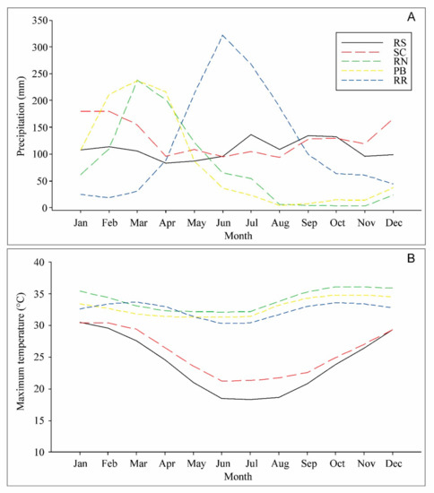 Climatic profile in the regions from where weedy rice accessions and cultivated rice were collected. Average rainfall (mm) (A); Maximum temperature (°C) (B). Source: Adapted from Diniz et al. [50].